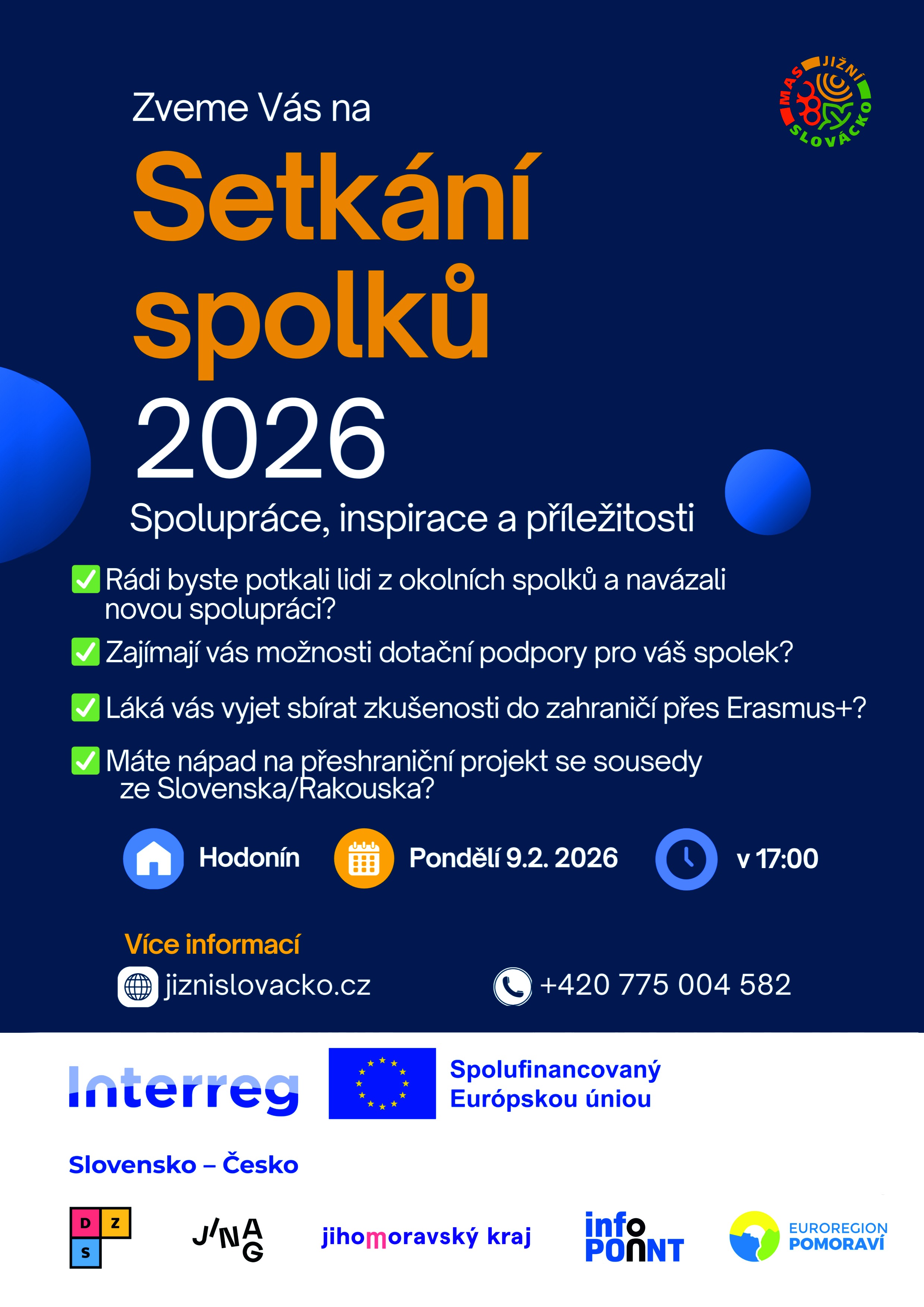 Dne 9. února 2026 se v prostorách Regionálního turistického informačního centra v Hodoníně na Masarykově náměstí uskutečnilo 1. Setkání spolků. Akce byla určena pro zástupce spolků a neziskových organizací působících v územní působnosti Místní akční skupiny Jižní Slovácko, z.s., a tedy i v gesci nově zřízeného Infopointu Hodonín.